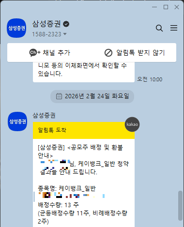 - 결과 확인: 균등 11주, 비례 2주(총 13주)는 2026년 공모주 시장 평균 이상의 우수한 성적입니다.